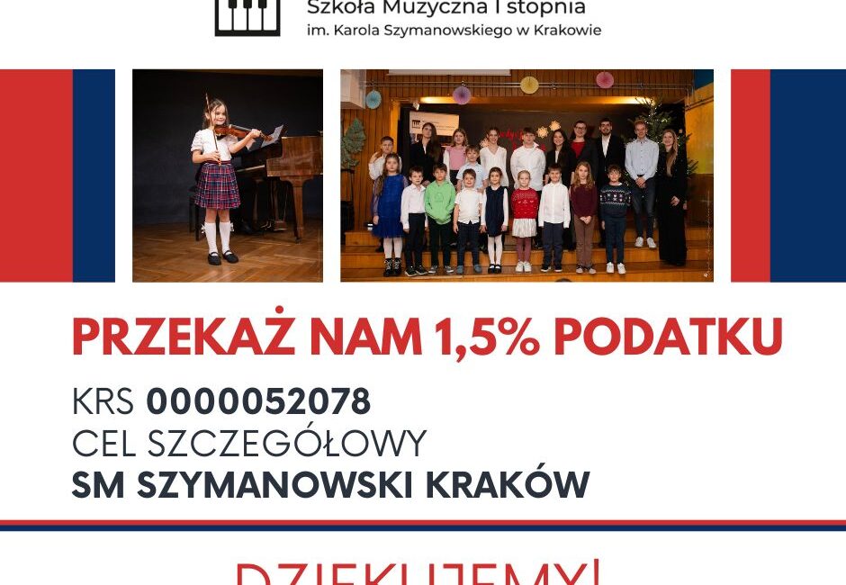 Jeśli bliska jest Ci edukacja muzyczna i rozwój dziecięcych talentów, możesz realnie pomóc – przekazując 1,5% swojego podatku na naszą Szkołę Muzyczną.